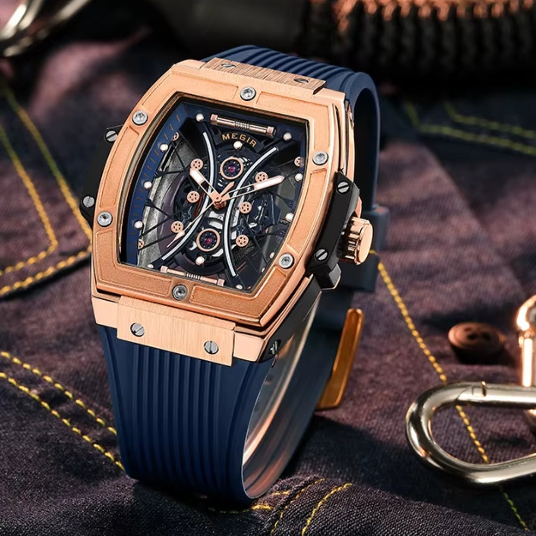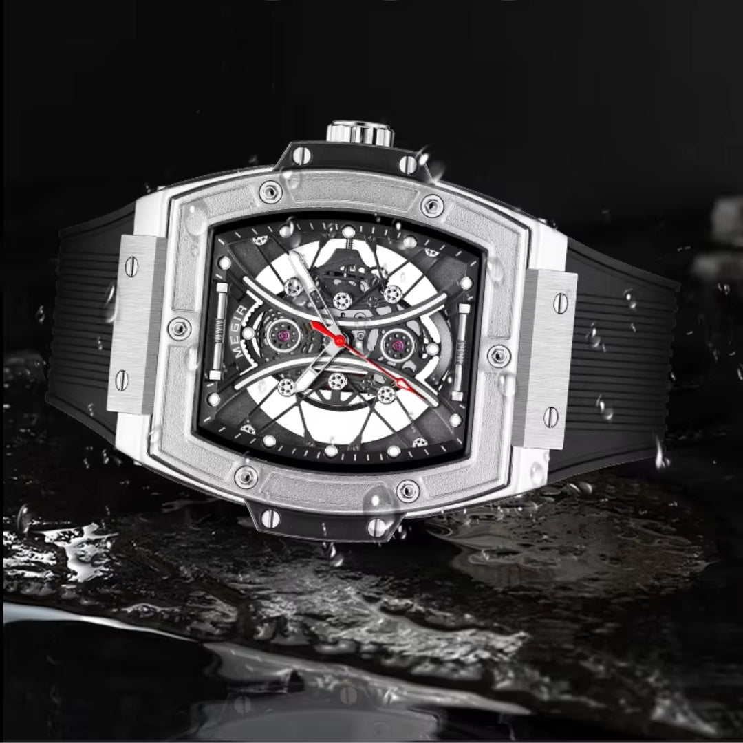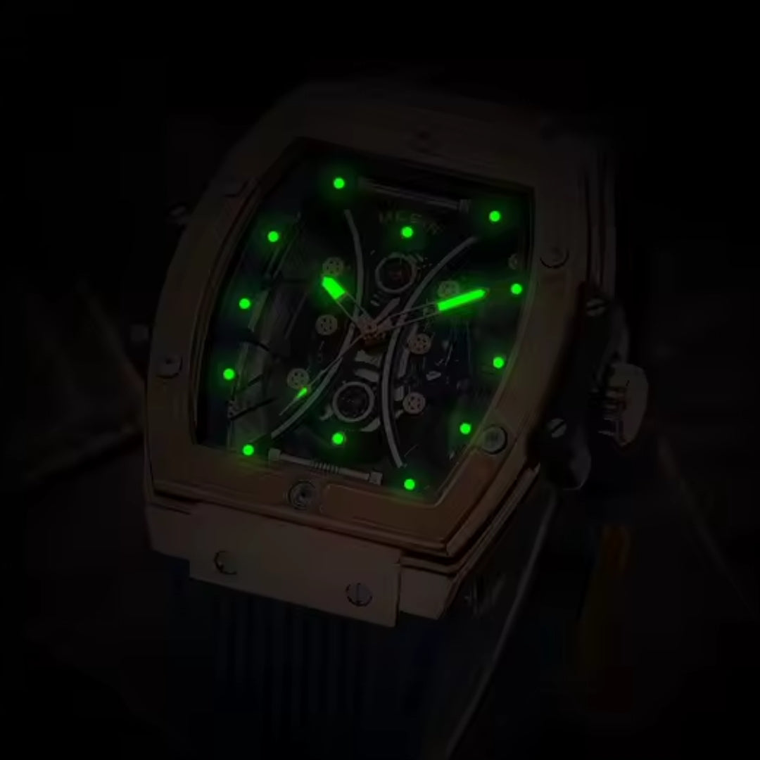 Fonctions : Aiguilles lumineuses, étanche, calendrier complet, chronographe