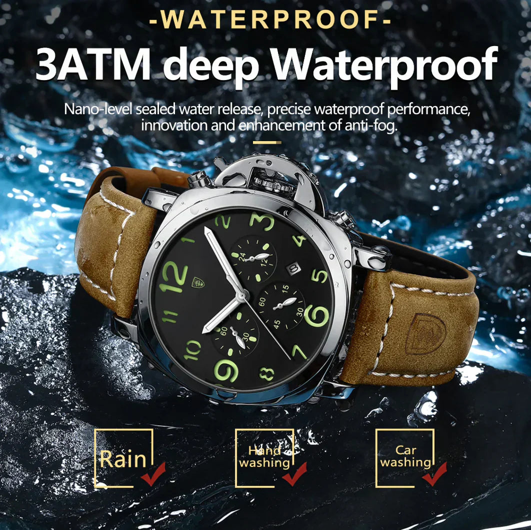 - Materials: Stainless Steel case, Leather strap, 3 Bar water resistance